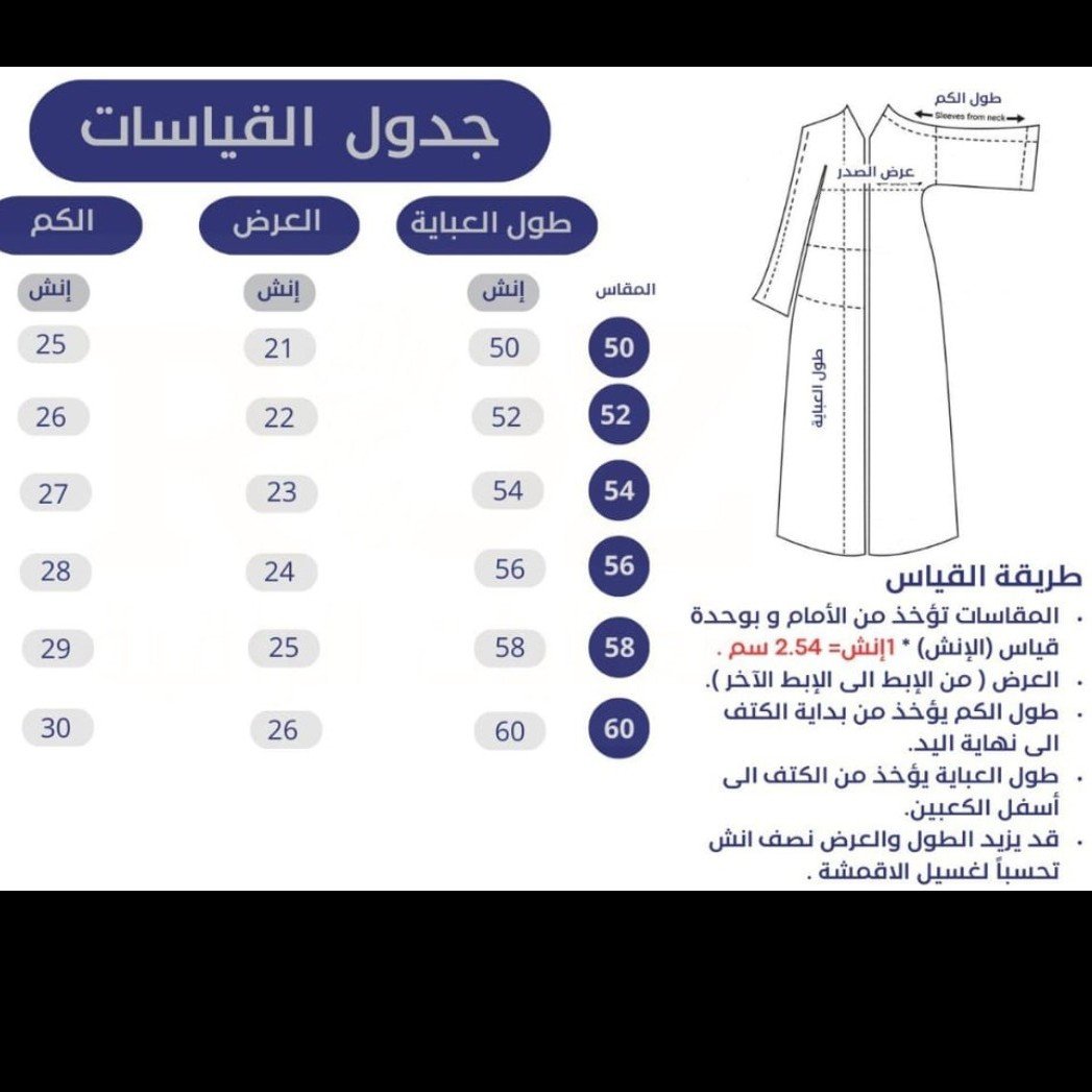 - المقاسات: 50، 52، 54، 56، 58، 60 .